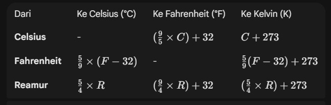 Celsius (°C): Skala yang paling banyak digunakan di dunia (termasuk Indonesia). Didasarkan pada titik beku air (0°) dan titik didih air (100°).