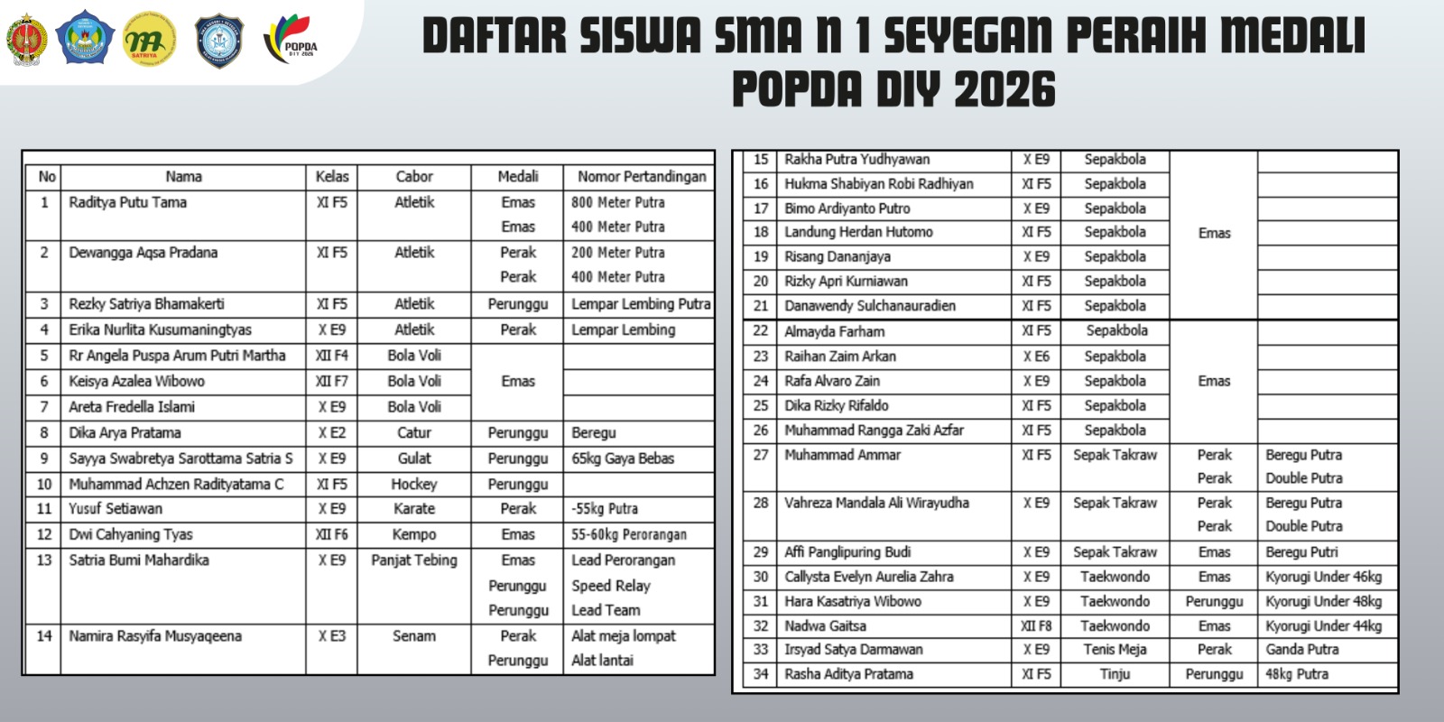 Keluarga besar SMAN 1 Seyegan tengah diselimuti rasa bangga dan syukur yang mendalam. Para atlet pelajar terbaik kita berhasil mengukir prestasi gemilang dalam ajang Pekan Olahraga Pelajar Daerah (POPDA) Daerah Istimewa Yogyakarta (DIY) tahun 2026.